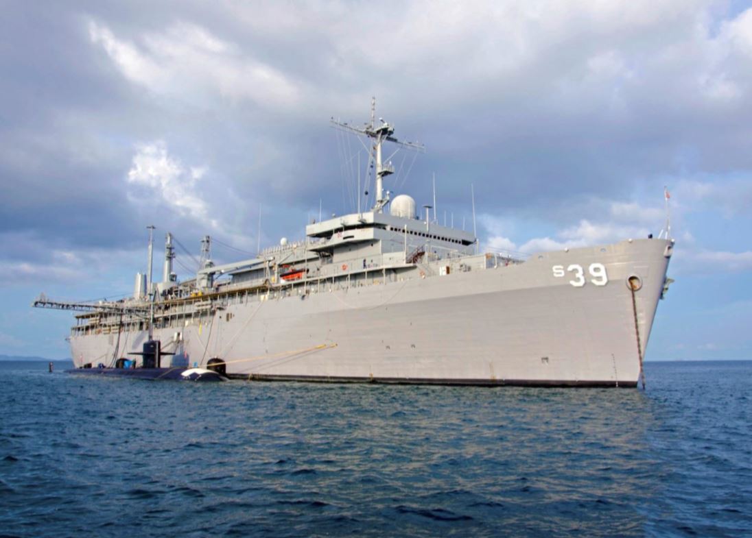 According to the U.S. Navy, “Under the current arrangement, Frank Cable services forward-deployed submarines home-ported in Guam, and Emory S. Land services 5th and 7th fleet submarines in Diego Garcia and other forward ports of call.” Although they are not normally assigned to travel with Carrier Strike Groups, both tenders do travel throughout the 5th and 7th Fleet’s area of responsibility, providing maintenance and repairs to ships and guided missile and fast-attack submarines. A submarine tender brings the repair capabilities of welding, carpentry, fabrication, sheet metal work, and machining with 24-hour day services for USN ships and subs docked at anchor or alongside the tender.