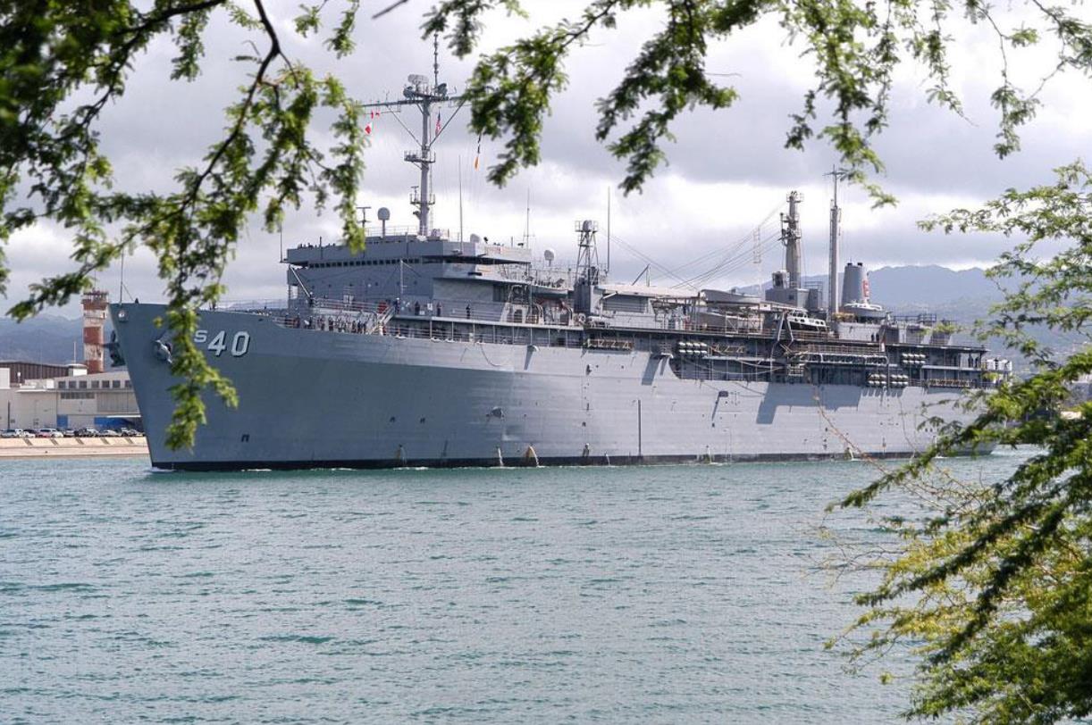 The two 644-foot sub tenders have a large crew, as the U.S. Navy explained via email: “The tenders are crewed/manned by Civilian Mariners (CIVMARs) and USN Military Personnel (MILPERS). There are sixteen (16) departments headed by USN MILPERS and CIVMAR officers. Supply and Health Services departments contain both MILPERS and CIVMAR components. In these departments, the USN component has a USN department head and the CIVMAR component has a CIVMAR department head. MILPERS are under Administrative Control (ADCON) of COMSUBPAC.
