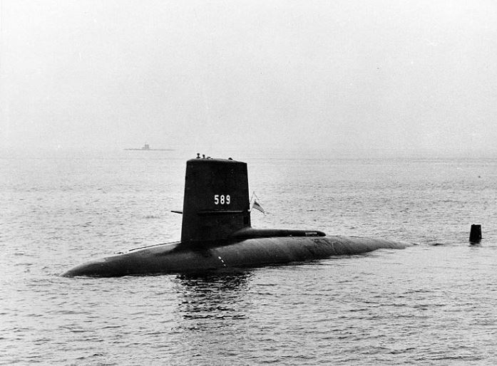 Photographed on 22 August 1960, off New London, Connecticut. A "GUPPY" type submarine is faintly visible in the distance, just beyond the forward tip of Scorpion's "sail". Photo: US Navy