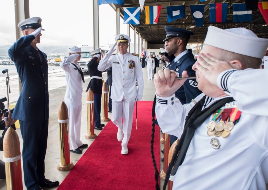 Adm. Phil Davidson, commander of U.S. Pacific Command (USPACOM), is piped aboard during the USPACOM change of command ceremony. Photo: US Navy