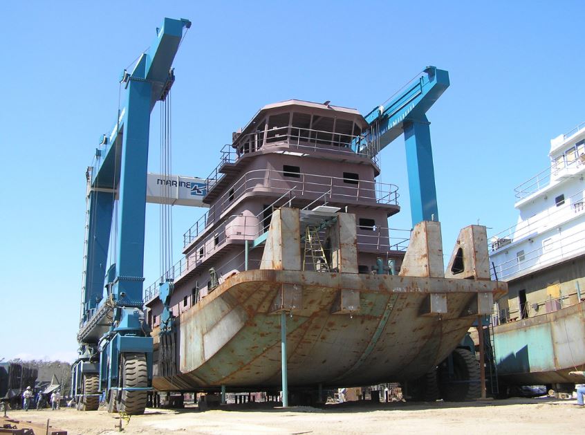 A steel tug sits on the 660-ton Travelift at Metal Shark’s newly-acquired Alabama Shipyard, formerly the home of Horizon Shipbuilding. Photo: Business Wire