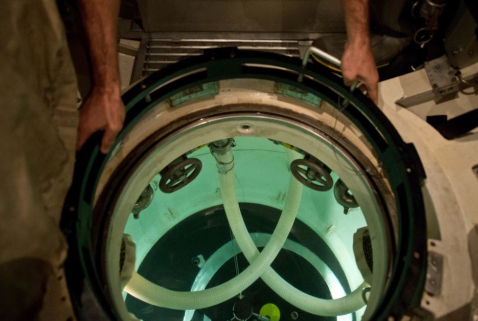 The transfer skirt hatch of the pressurized rescue module (PRM) of Undersea Rescue Command (URC) opens after mating with CS Simpson (SS 21). Photo: US Navy