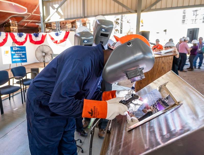 Demetrica Hawkins, a structural welder at Ingalls Shipbuilding, welded ship sponsor Laura Cavallo’s initials onto a steel plate, signifying the keel of NSC 9 as being “truly and fairly laid.” Photo: Derek Fountain/HII