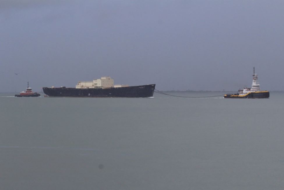 The vessel is being towed from Galveston to the International Shipbreaking Limited facility after undergoing radiological decommissioning that included the safe removal of all components of the deactivated nuclear reactor and all associated radioactive waste that was formerly onboard.