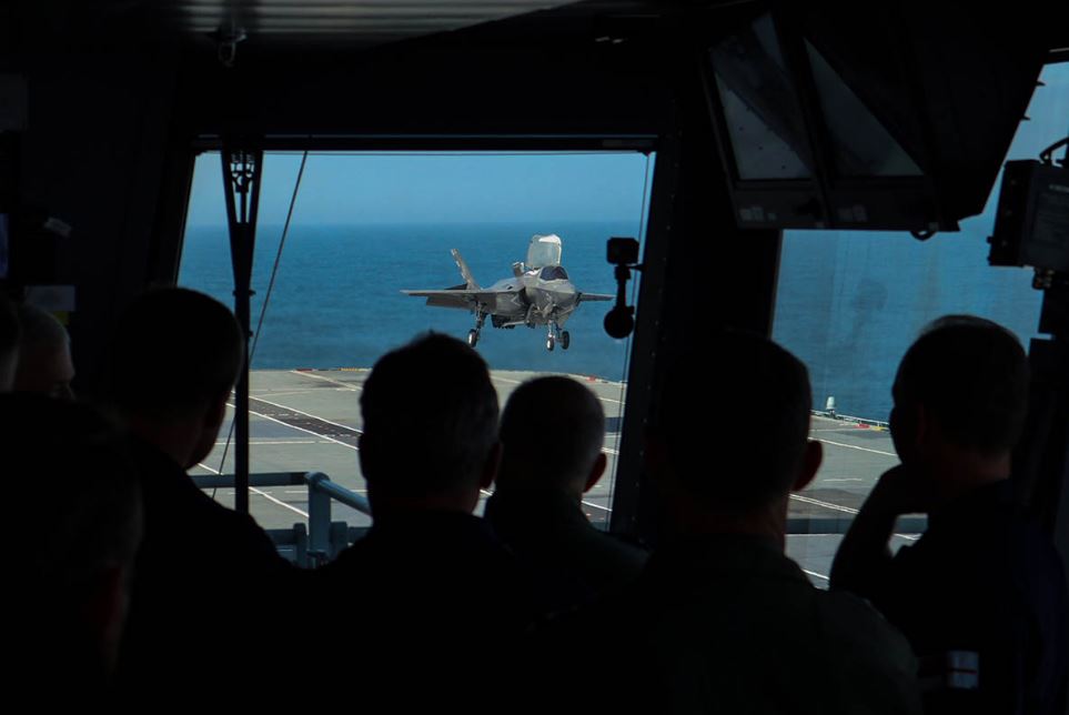 Observers from the bridge witness Royal Navy pilot Commander Nathan Gray RN landing his F-35 Lightning jet on board HMS Queen Elizabeth for the second time. Photo: Royal Navy