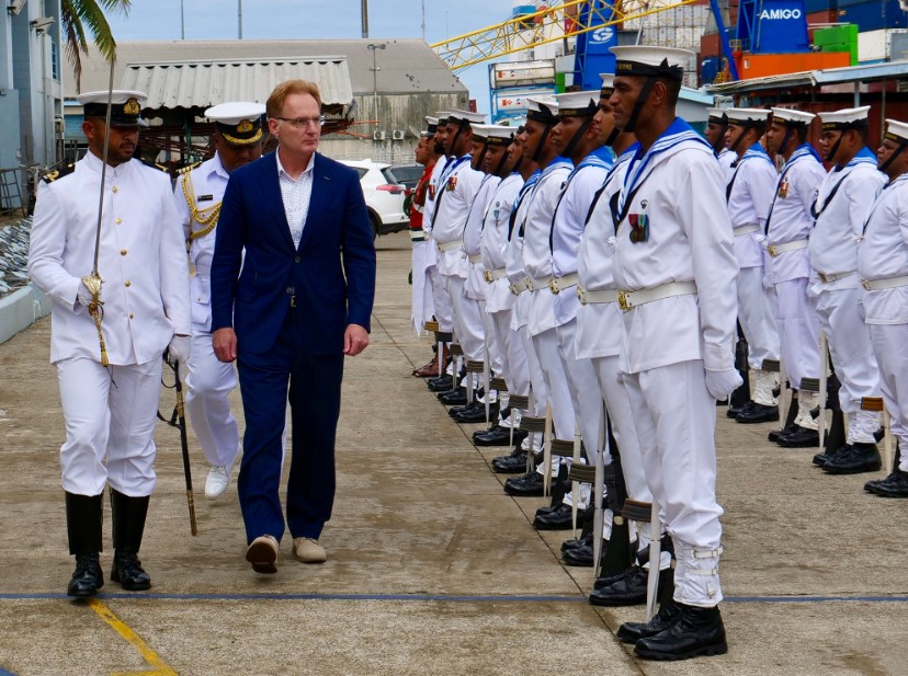 Under Secretary of the Navy Thomas Modly conducts a pass in review at the Stanley Brown Naval Base during a Sept. 27, 2018 visit to Fiji. Photo: Cmdr. Scott McIlnay