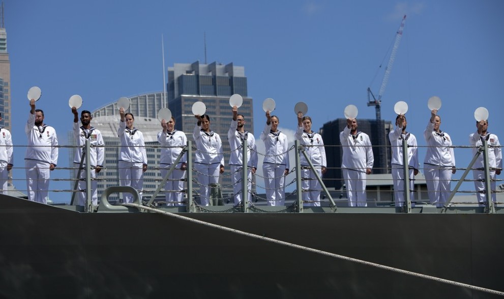 The ship’s company of HMAS Brisbane line the upper decks and cheer ship during HMAS Brisbane’s commissioning ceremony held at Garden Island, Sydney.