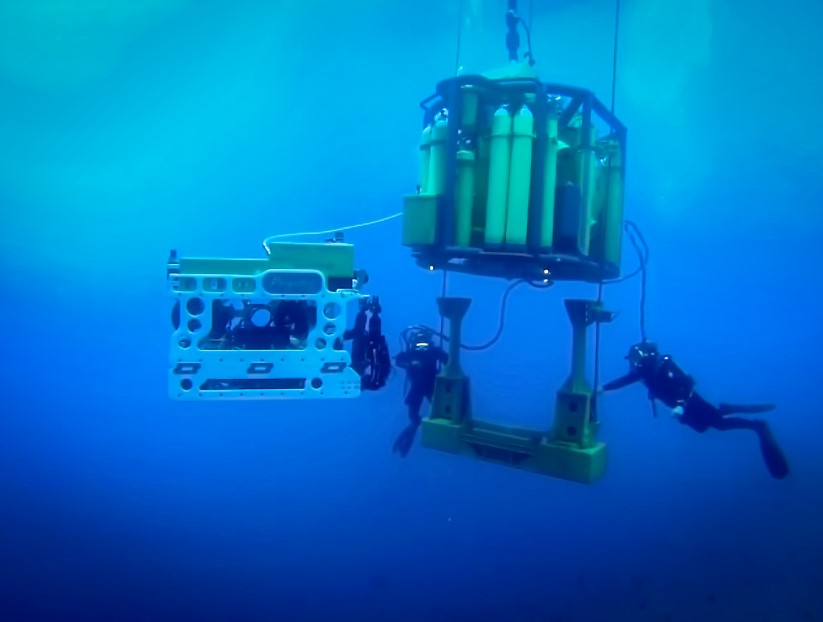 Italian Navy photo of a submarine rescue vehicle mated onto a submarine hatch
