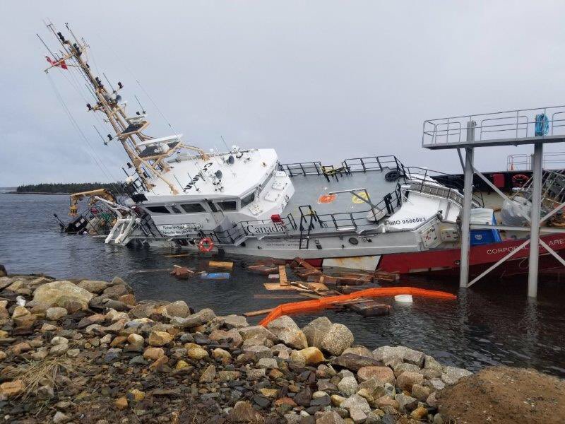 The Hero-class patrol vessel CCGS Corporal McLaren is partially submerged following the incident which Halifax police are investigating as a possible case of vandalism.