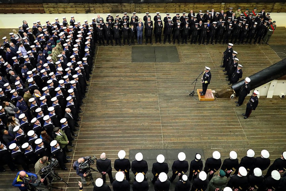 First Sea Lord Admiral Sir Philip Jones addressed the ship’s company of HMS Albion in the well dock as the ship returned home. Photo: Royal Navy