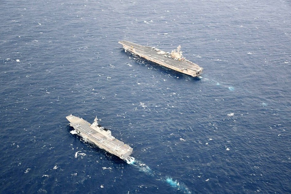 Ships from the US Navy’s Japan-based carrier strike group centered around aircraft carrier USS Ronald Reagan teamed up with the Japan Maritime Self Defense Force helicopter destroyer JS Hyuga (DDH 181) for joint operations in the Philippine Sea.