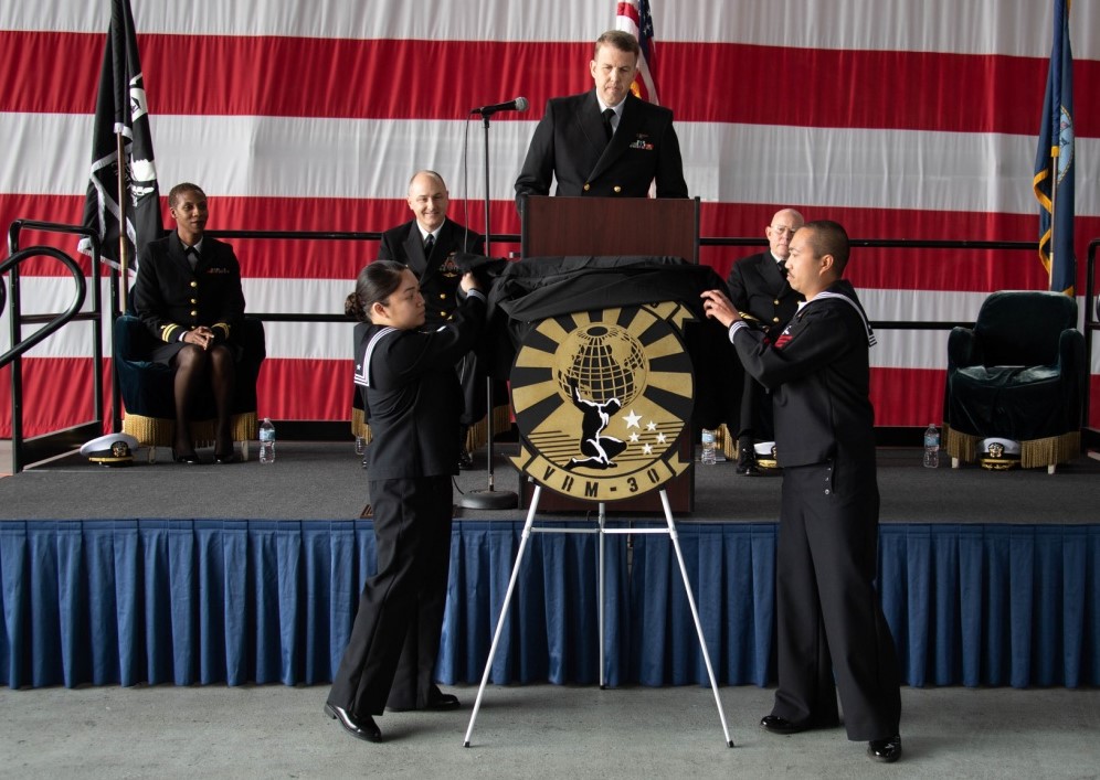 Squadron plank owners reveal the new logo for Fleet Logistics Multi-Mission Squadron 30 Titans (VRM-30) at the establishment ceremony. Photo: US Navy