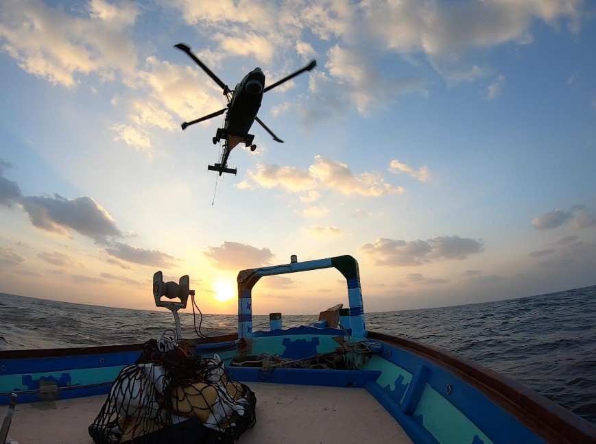 During the drugs bust, the weather rapidly deteriorated, resulting in increasingly hazardous conditions. The ship’s Wildcat helicopter was deployed to speed the process of transferring the drugs back to the warship.