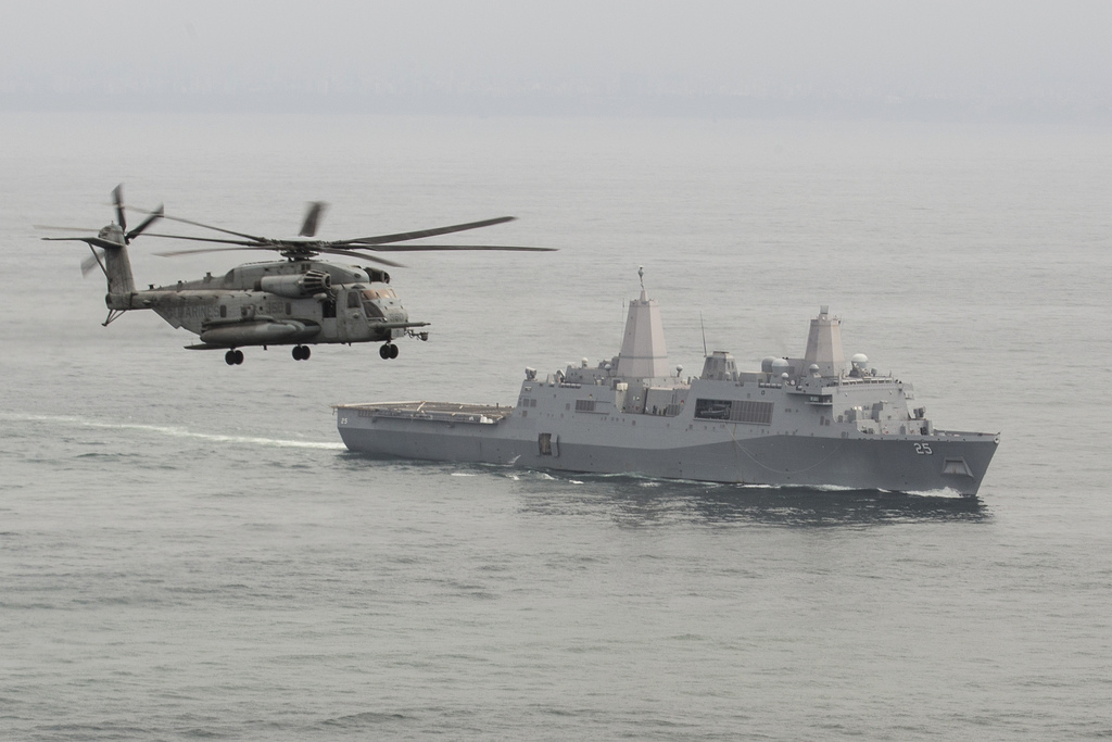 A US Marine Corps CH-53E Super Stallion flies above USS Somerset (LPD 25) during a humanitarian assistance and disaster relief exercise off the coast of Peru in November. Photo: US Navy