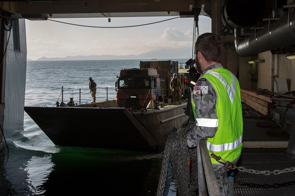 An Australian Army LCM8 landing craft enters the well dock of HMAS Choules in Townsville, Queensland. Photo: Royal Australian Navy