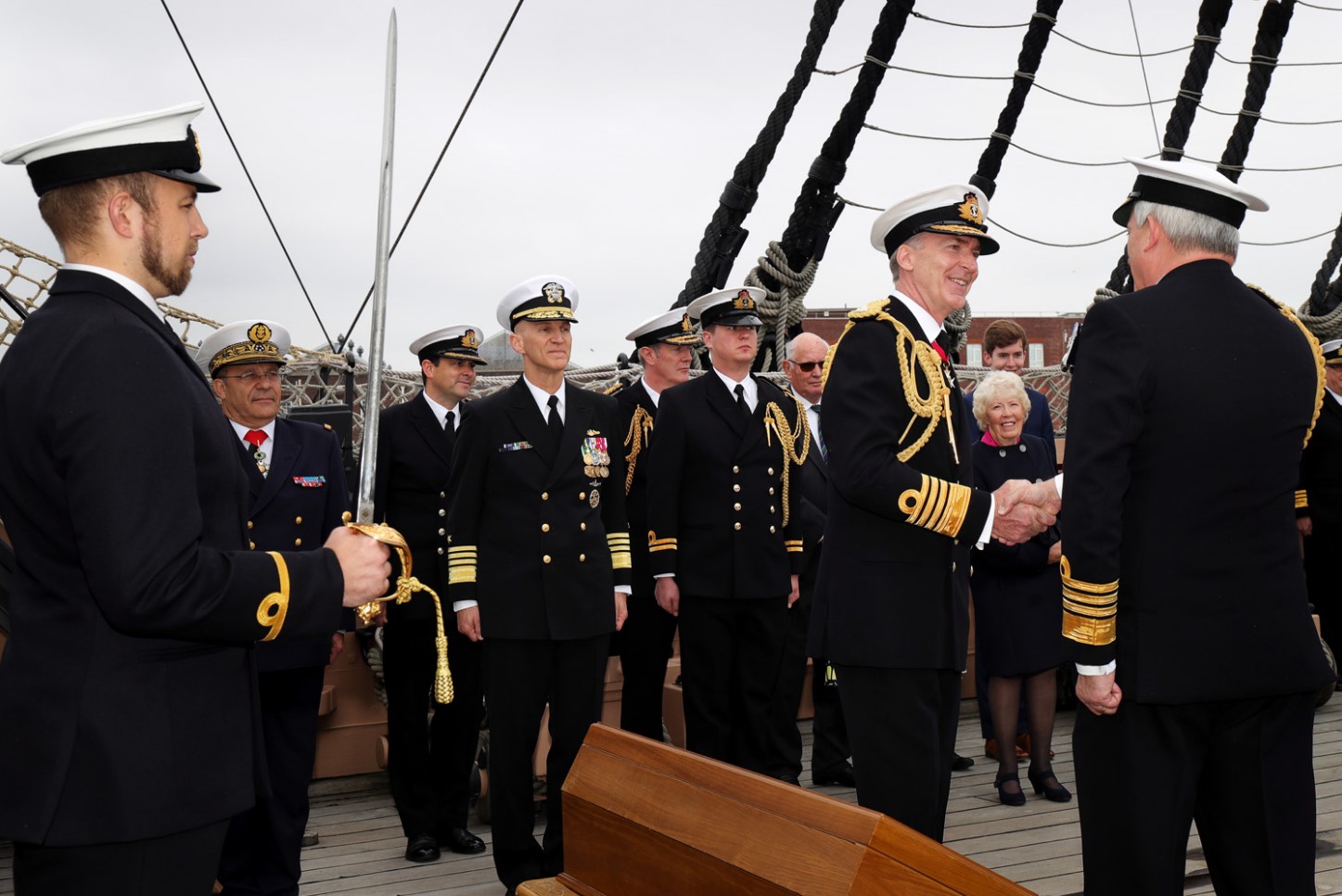 Admiral Tony Radakin and Admiral Philip Jones during the last act of the ceremony on the quarterdeck of HMS Victory 2019. Photo: Royal Navy