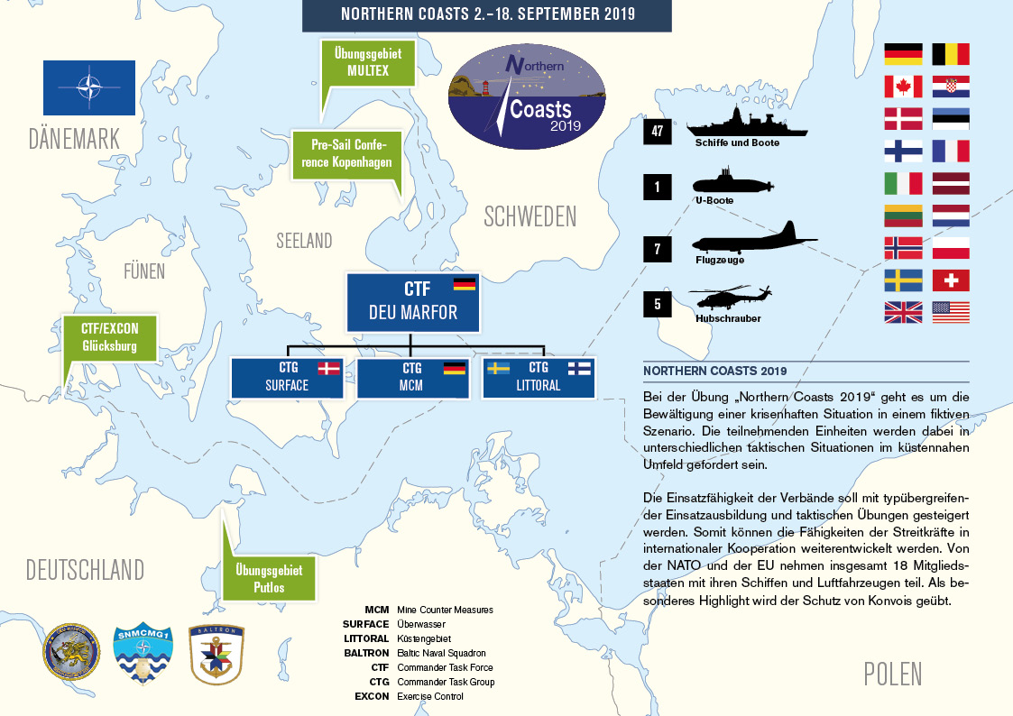 German Navy admiral Stephan Haisch will lead the units involved in the exercise as Commander Task Force 356 from the operations center of the German Navy in Glücksburg.