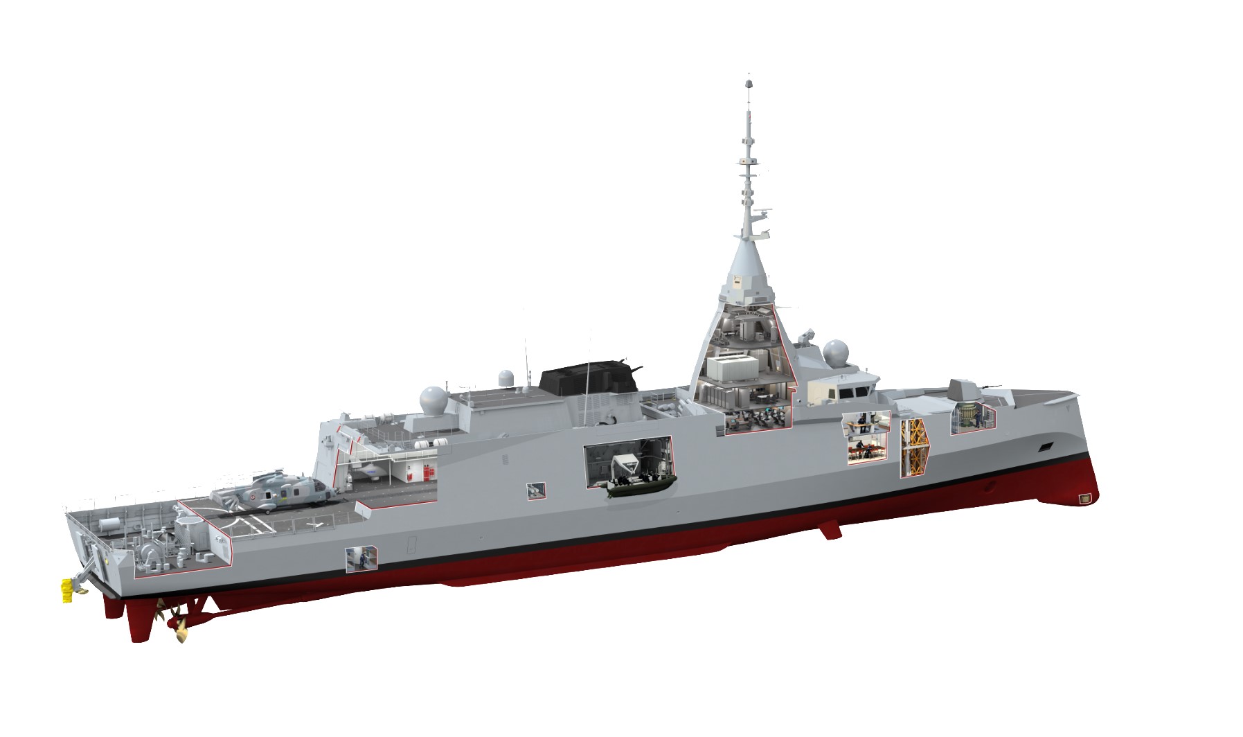 Armed with Exocet MM40 B3C anti-ship missiles, Aster 15 and Aster 30 anti-aircraft missiles and MU90 anti-submarine torpedoes, the frigates will be capable of simultaneously operating a helicopter and an aerial drone, in addition to deploying special operations forces via two commando boats.