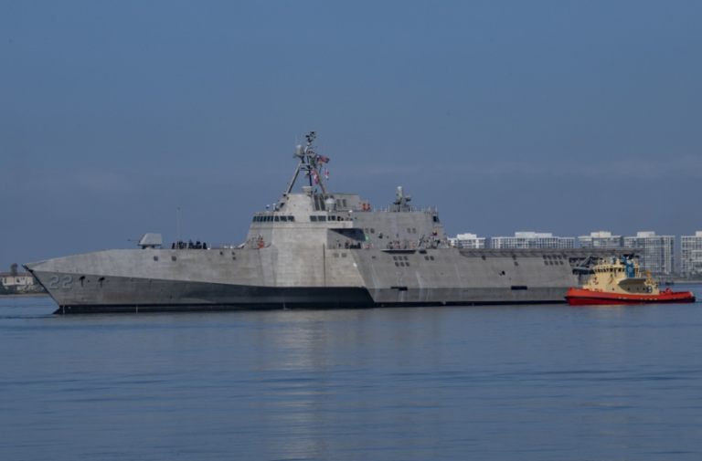 The future USS Kansas City (LCS 22) arrived for the first time at Naval Base San Diego, where the navy will commission the Independence-variant littoral combat ship (LCS) on June 20.