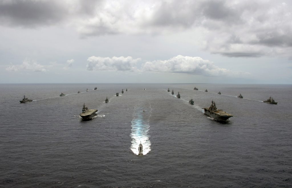 Multinational navy ships and a submarine steam in formation during a group sail off the coast of Hawaii during RIMPAC 2020, August 21. Photo: US Navy