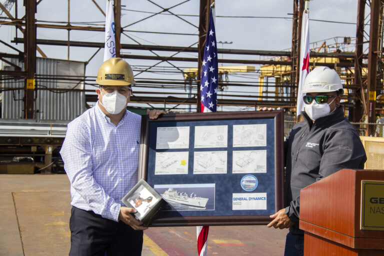 Due to current COVID-19 restrictions, representatives from NASSCO and the U.S. Navy gathered for a hybrid virtual and in-person steel cutting ceremony.
