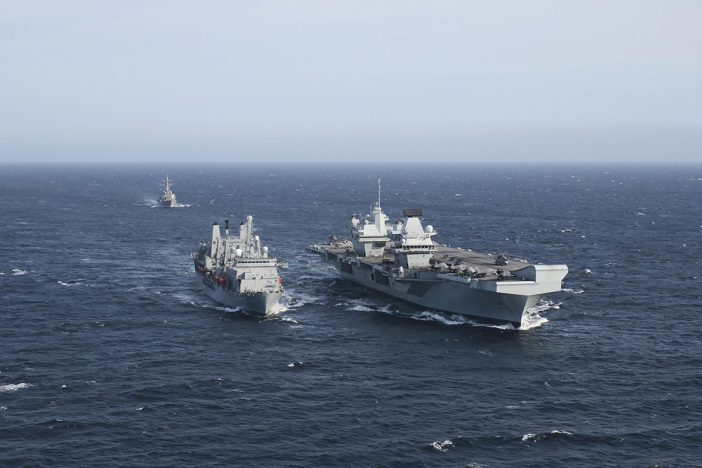 Joining HMS Queen Elizabeth on its maiden deployment were destroyers HMS Diamond and Defender; frigates HMS Richmond and Kent; an Astute-class submarine in support below the waves; and Royal Fleet Auxiliary support ships RFA Fort Victoria and RFA Tidespring.