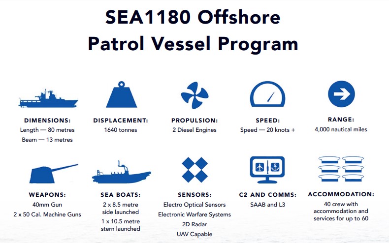 Defense company Luerssen Australia became the prime contractor on the RAN’s SEA1180 program to build twelve Arafura-class OPVs after winning the contract at the end of 2017, with two to be built in Osborne and ten in Henderson, Western Australia. The firm is building the vessels in cooperation with Australia’s ASC Pty.