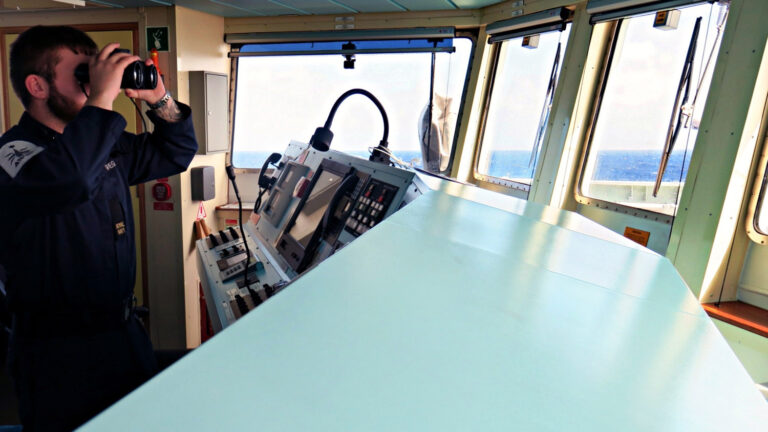 A sailor on HMS Tamar’s bridge scans the East China Sea for contacts. Source: Royal Navy