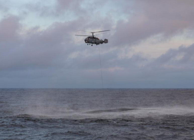 The crews of Slava-class cruiser Marshal Ustinov and Admiral Gorshkov-class frigate Admiral Kasatonov aided by a specially equipped anti-submarine helicopter Kamov Ka-27practiced operations to locate potential enemy submarines.