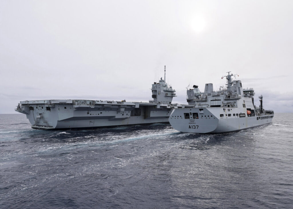 HMS Prince of Wales sails next to RFA Tidesurge in preparation for a RAS (replenishment at sea) after leaving Reykjavik, Iceland. Photo by: Royal Navy