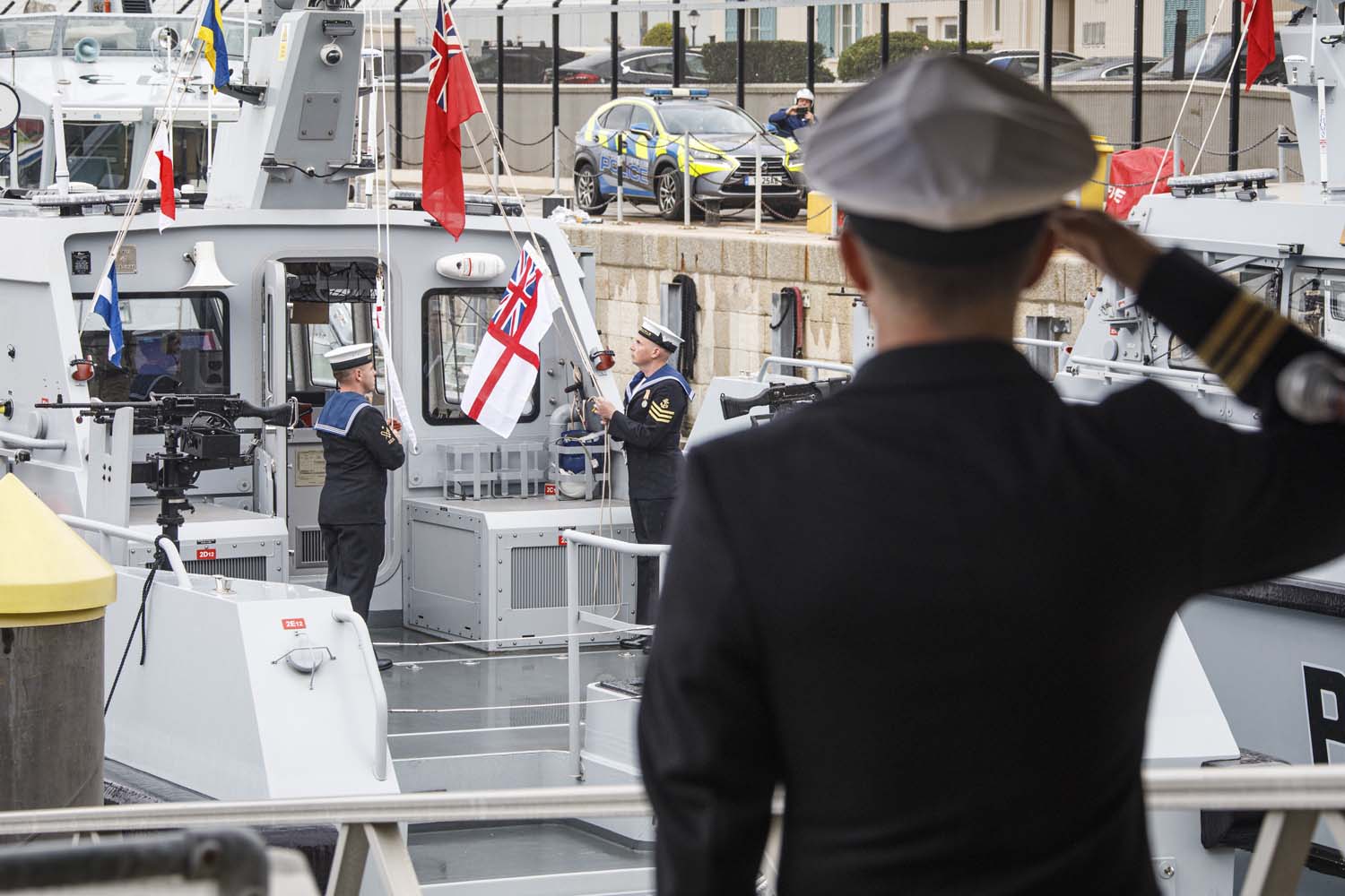 The White Ensign was hoisted for the first time on HMS Cutlass in a ceremony at Gibraltar Naval Base on 5 May. The vessel has now started patrols after months of rigorous trials.