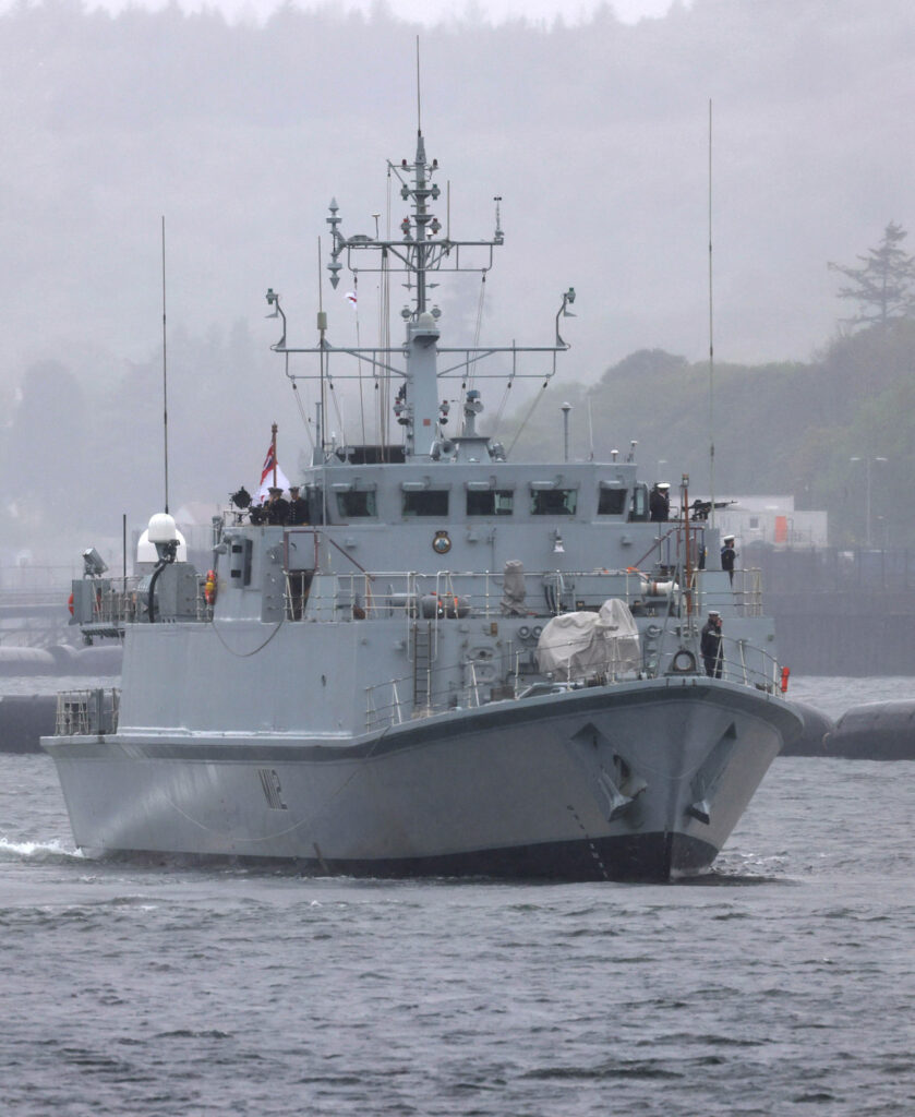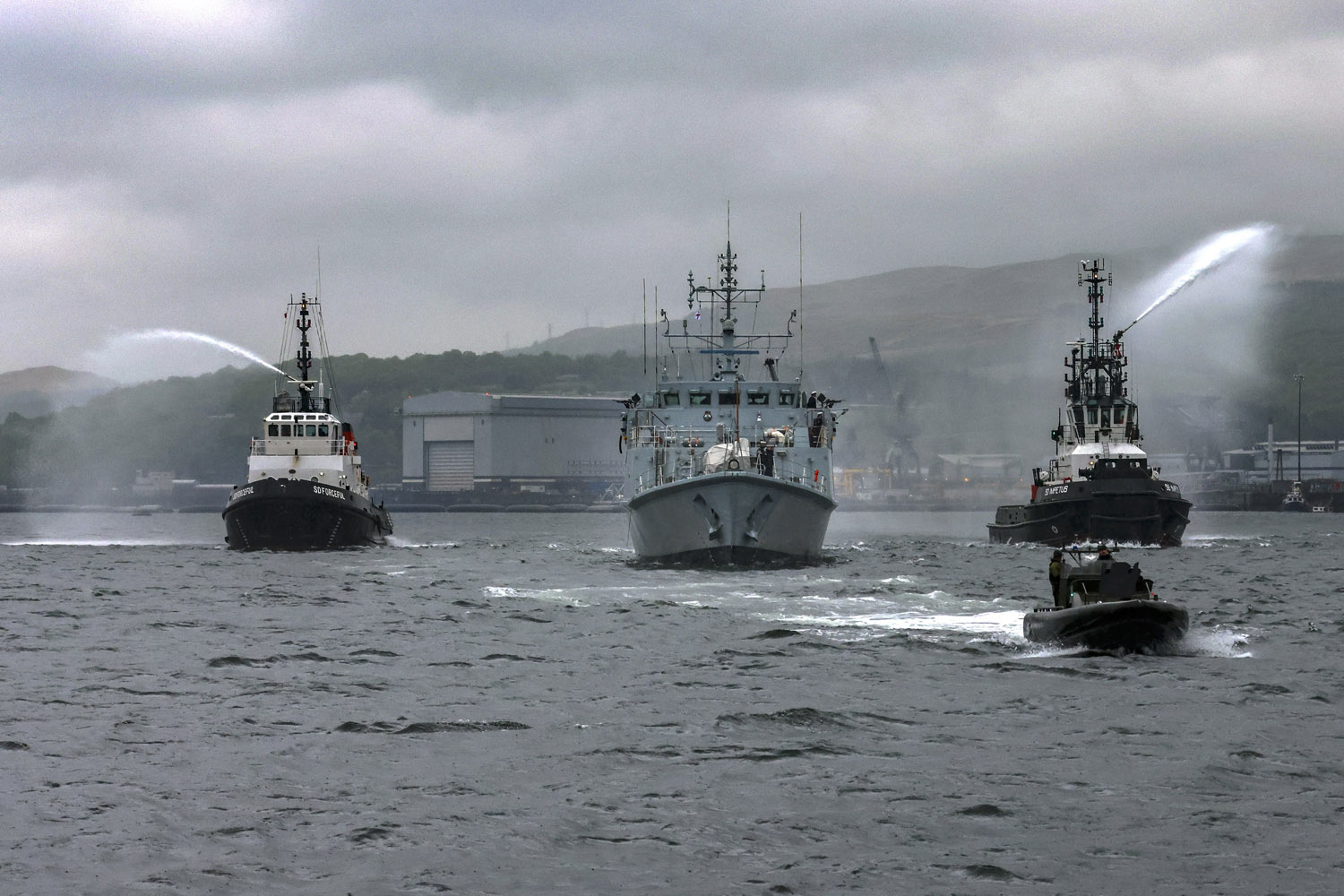 The minehunter was escorted out of Gareloch and into the Clyde by Royal Marines craft and the Faslane Patrol Boat Squadron on 10 May.