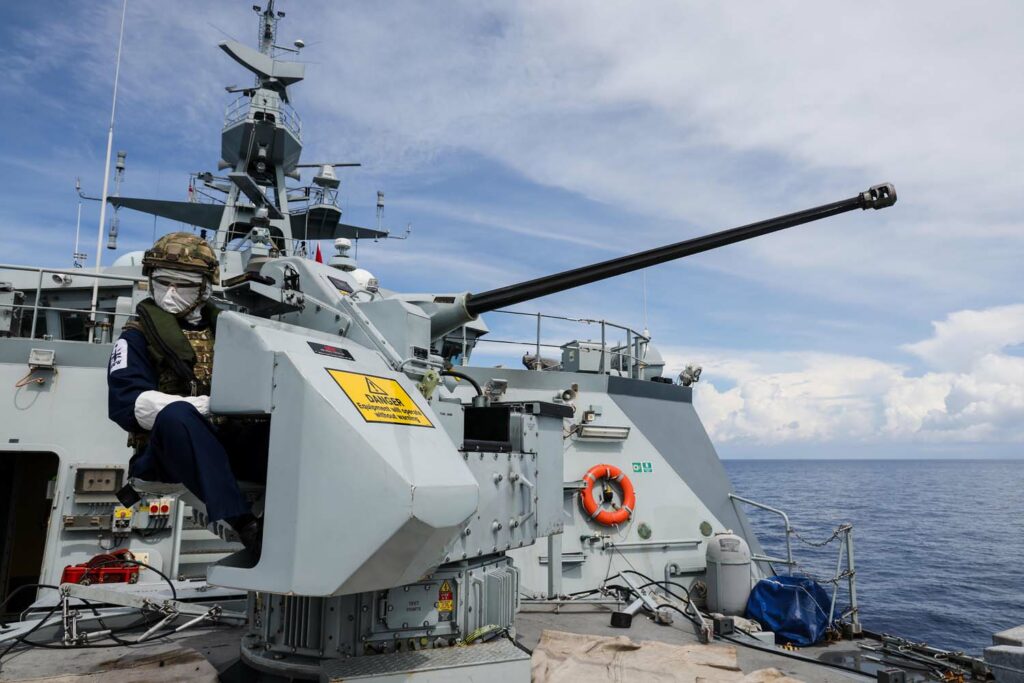 HMS Tamar’s 30mm Weapons Crew prepare the weapon for firing prior to a shoot in the Pacific Ocean. Photo: Royal Navy