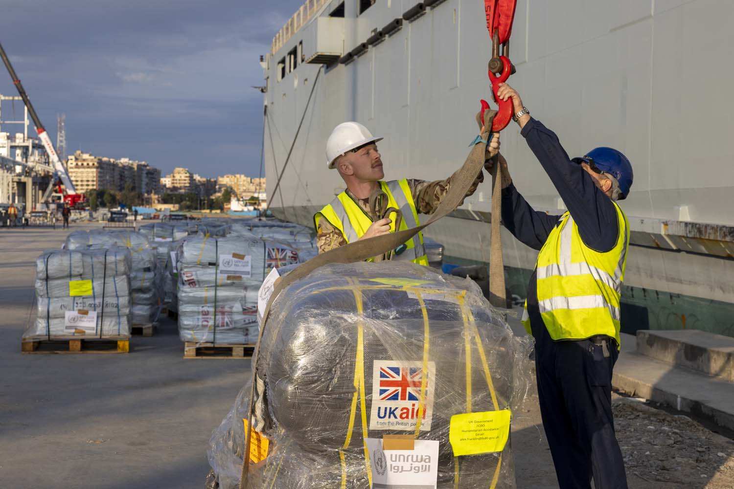 Royal Fleet Auxiliary ship RFA Lyme Bay delivered more than 300 pallets of UK aid as well as medical supplies on behalf of the Republic of Cyprus into Port Said, Egypt.