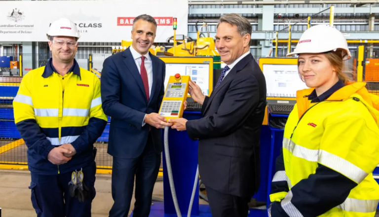 The steel was cut at Osbourne Naval Shipyard in Adelaide for the Royal Australian Navy’s first Hunter-class frigate.