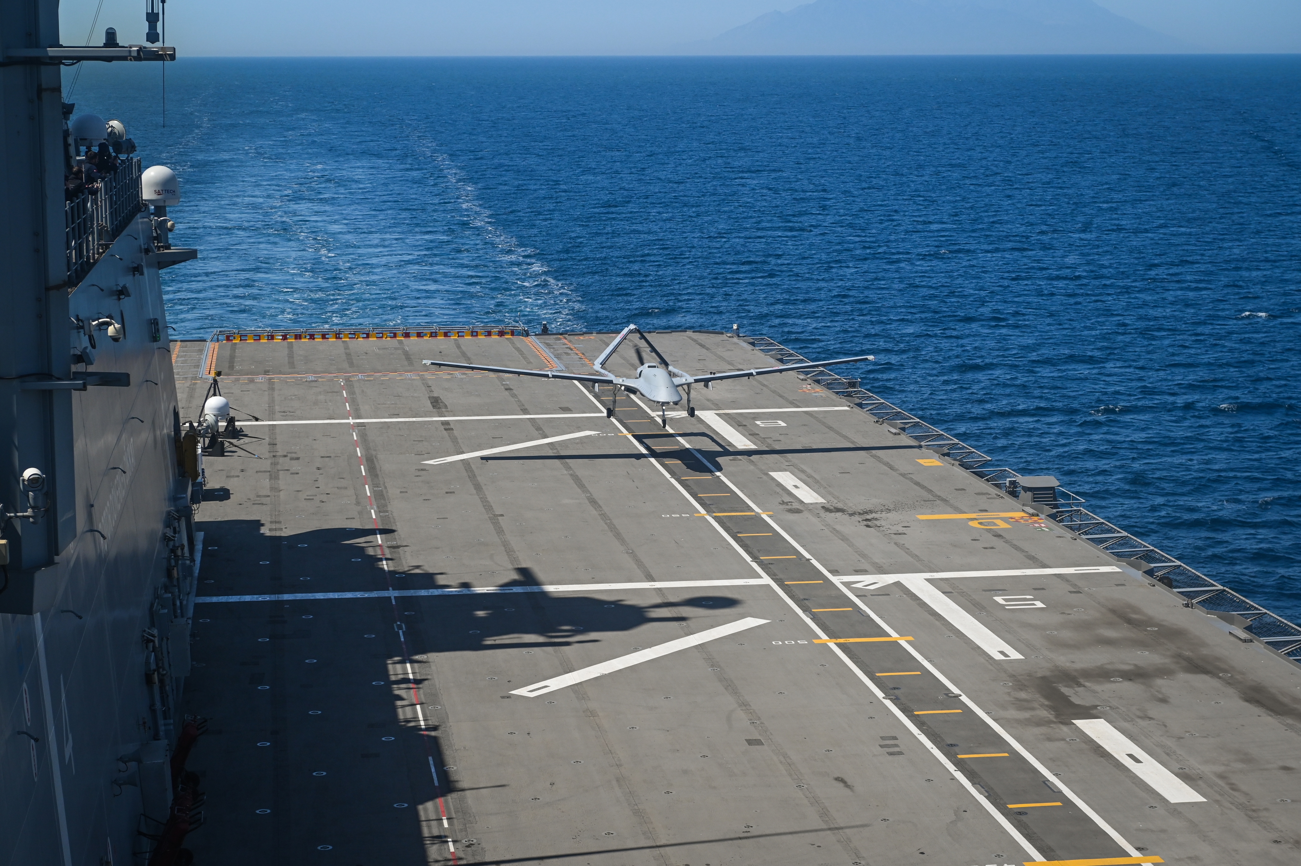 During the test, Bayraktar TB3 carried out four sorties on the TCG Anadolu, which was sailing in the Gulf of Saros, while its final sortie was performed at sunset. As in previous trials, the UCAV landed on the short runway without the use of any landing assistance equipment.