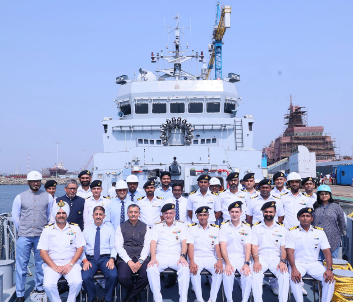The vessel’s propulsion is powered by three marine diesel engine-driven water jets, making it suitable for coastal operations. Its shallow draft of just 2.7 meters enables access to near-shore zones that larger ships cannot navigate, ensuring comprehensive area coverage, according to GRSE. The ship will operate with a crew of 57 personnel, including seven officers.
