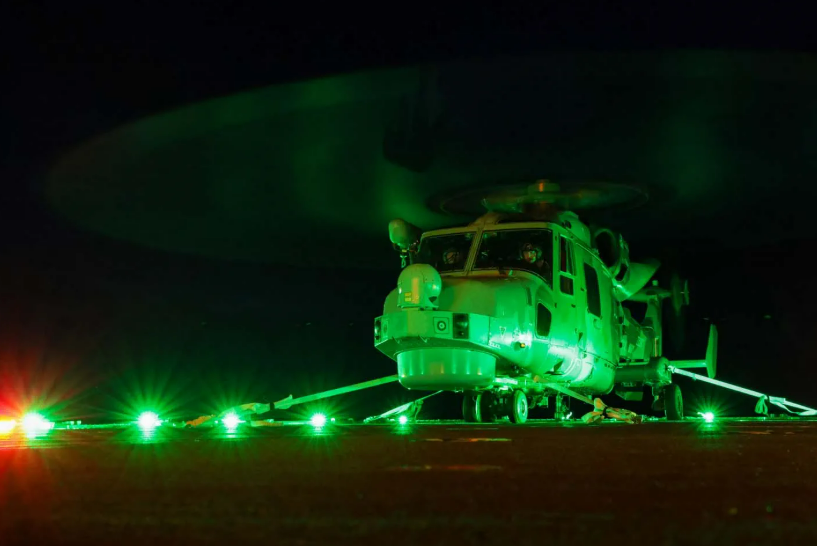 HMS Trent carried out three days of concentrated flying operations with a Wildcat attack helicopter to test a new lighting setup known as a helicopter visual landing aid system (HVLAS), which provides a guide for pilots to land onto the ship’s flight deck in adverse conditions or at night.