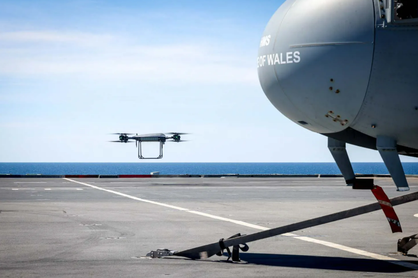 A Malloy T-150 quadcopter flew from flagship, Queen Elizabeth-class aircraft carrier HMS Prince of Wales, to destroyer Type 45 HMS Dauntless during the UK Carrier Strike Group deployment. The drone was carrying critical supplies, including spare and repair parts, from ship to ship.