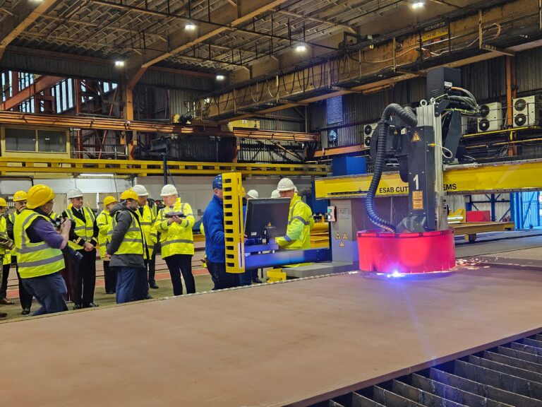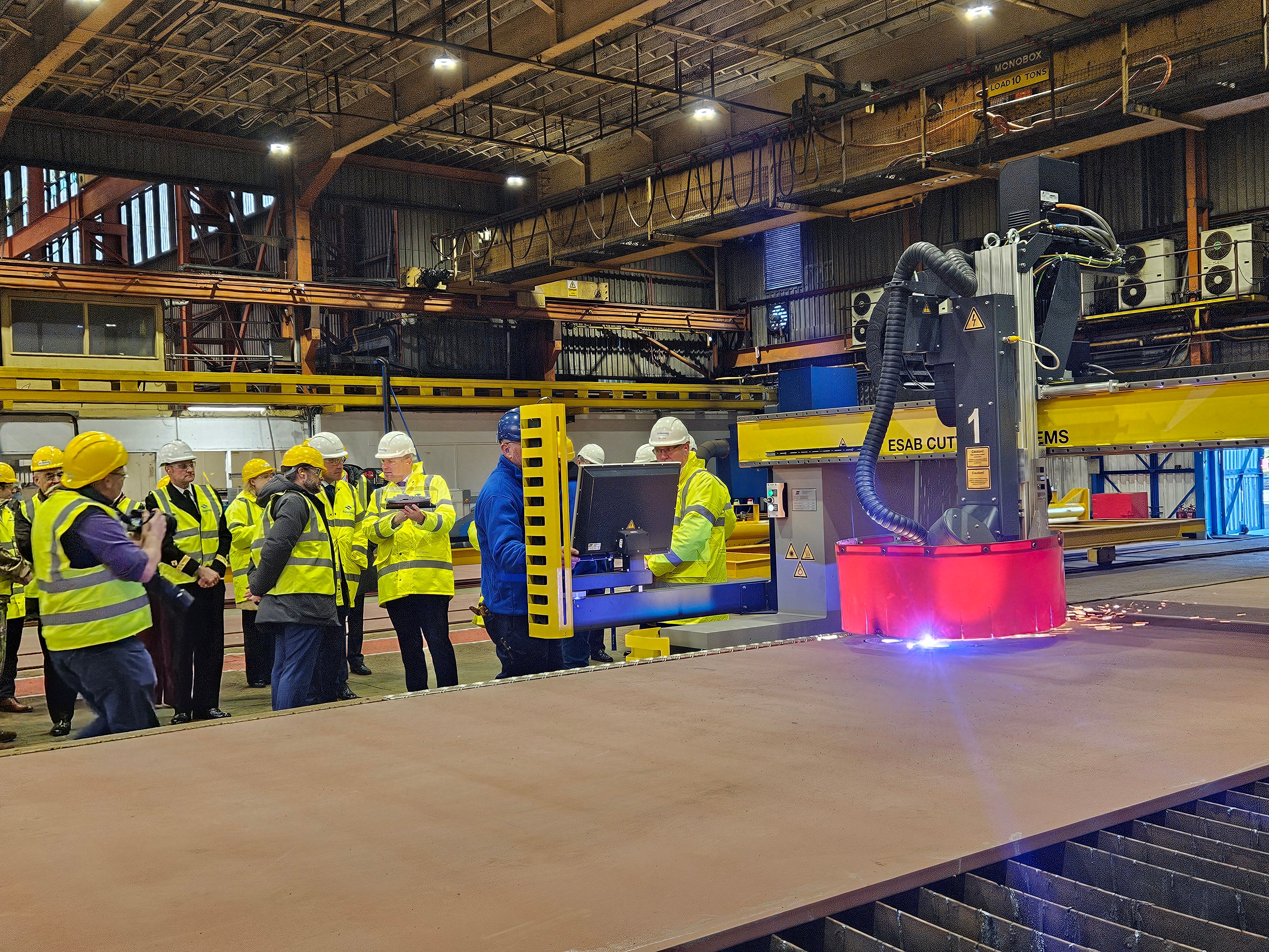 At Navantia UK’s Appledore shipyard in North Devon, the traditional steel-cutting ceremony has marked the start of construction on the first vessel in the Fleet Solid Support (FSS) program for the Royal Navy.