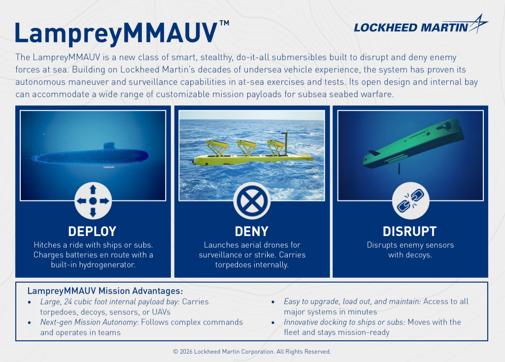 As informed, LampreyMMAUV can perform a wide range of missions, including delivering undersea and air kinetic and non-kinetic effects; performing intelligence, surveillance, reconnaissance, targeting, and multi-intelligence collection; and deploying equipment to the seafloor.